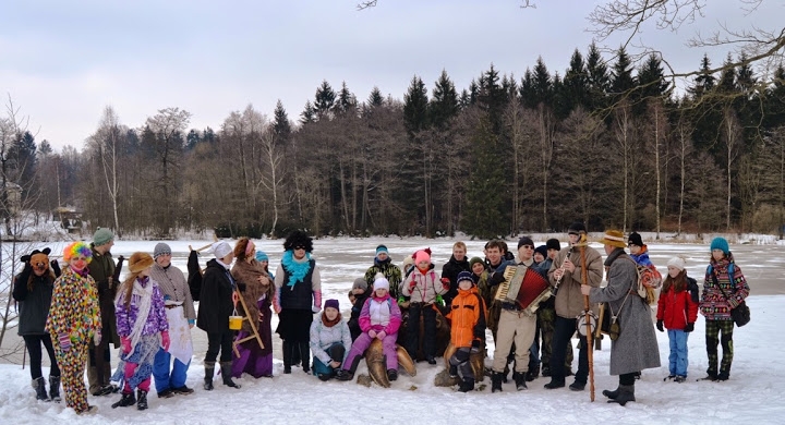 Když nám začala být zima, vydali jsme se dál, abychom našli vhodné místo na oběd. Minuli jsme dělníky podniku Lesy ČR, pro jistotu šli ještě asi půl kilometru a pak jsme rozdělali oheň. Příjemně jsme se ohřáli, opekli si chleba a snědli ho s paštikou nebo ďábelskými tousty. Protože jsme byli už jen kousek od Račína, vyrazili jsme s vidinou teplé polévky a útulného prostředí místní hospody. Cestou jsme ještě u račínského rybníka potkali masopustní průvod. Maškary se s námi vyfotily a k lepšímu daly bujarou písničku doprovázenou na akordeon a ozembouch. V hospodě jsme si pak každý dali na společný účet polévku a na vlastní útratu pití. Já sám jsem si dal gulášovku, která byla naprosto vynikající; jako alternativu hostinec nabízel ještě česnečku a vývar.