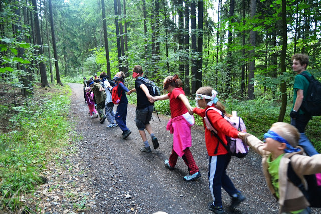 Zde bylo za úkol udržet se 2 minuty na stromě, který si každý sám vybral. U dalšího fáborku bylo nutné zavázat si oči a pokračovat tak v cestě. Jakmile jsme objevili nový fáborek, mohli jsme si sundat šátky z očí, zatímco Kadli měl svoje oči zavřít a ostatní se ho měli dotknout tak, aby nás neslyšel. Pak jsme si ve dvojici svázali nohy k sobě a takto došli ke studánce.