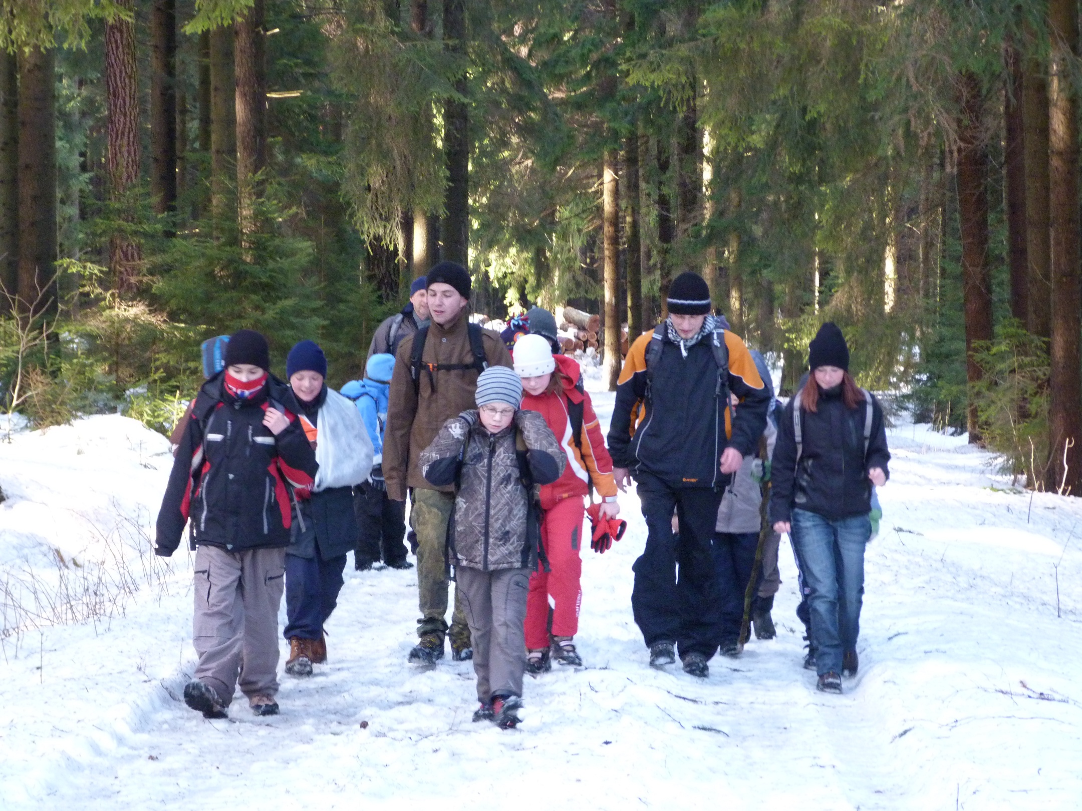 V 9 hodin jsme se sešli u Pilské nádrže, potom jsme šli podle GPS po stopách velmistra na určené souřadnice. Cestou jsme hráli kolíčky. Když jsme tam došli, tak jsme měli hledat něco divného, nakonec jsme našli plechovku, která byla na padáku. V plechovce byla zpráva, ve které vyšlo, že se máme vydat na Adamův kopec. Pak jsme šli dál směrem na Polničku. Cestou jsme hráli hry kámen, nůžky, papír, na čarodějnice, obry a skřítky…. Došli do Polničky a u cyklostezky jsme našli další plechovku. V plechovce byl klíč a zpráva: Když jsem velmistra našel, byl již mrtev, vše co zbylo, byl jen klíč. Potom jsme se po cyklostezce vrátili zpátky k Pilské nádrži.