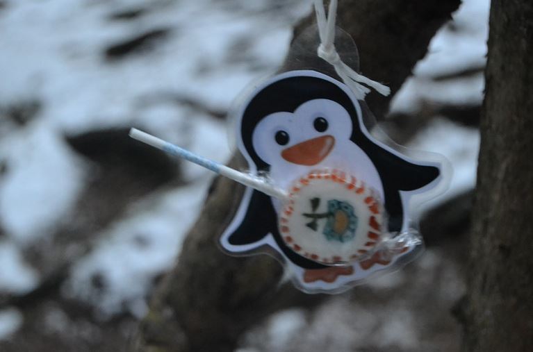 U první studánky jsme našli pouze vajíčka tučňáků ve studené vodě. Tučňáci před námi utekli, protože jsme byli hrozně hluční. Vylovili jsme si aspoň tyto vajíčka pro štěstí a pod vedením Šárky a Marečka se vydali k mamutovi. Tam ovšem byla spousta lidí, takže ani tady jsme nenašli žádné tučňáky. Tak jsme si aspoň zahráli na tuleně a lachtany a dali si svačinku číslo 3. Pak jsme na kraji lesa našli na zemi stopy tučňáků (vypadající jako opačné šipky) a vydali se po nich. Po cestě jsme několikrát trénovali "tichý příchod" k tučňákům, protože tentokrát už jsme je vyplašit nechtěli. Potom jsme po stopách tučňáků došli až k další studánce, kde už jsme tučňáky konečně našli. Každý jsem si jednoho tučňáka i se sladkou odměnou odnesli domů. Pak už jsme rychle utíkali kolem sochy koně k zahradě Vysočina, kde byl konec akce.