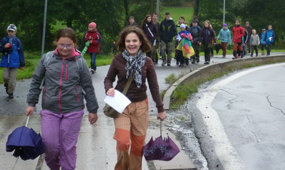 První zastávka byla na mostě k Hamrům, kde jsme chtěli zamávat svými šátky na vlak. ten ale bohužel nejel, tak jsme mávali aspoň autům. Potom jsme si zahráli na Kevina. U toho jsme si mohli klidně zařvat, protože kolemjedoucí auta to lehce přehlušila. Hned nato jsme se rozdělili na mladší a starší a každá skupina šla jinou cestou. Starší zjišťovali počet oblouků u viaduktu, jméno veterináře v ordinaci u čističky a počet a barvu kontejnerů na odpad v novém sídlišti Hamry. Mladší zatím sledovali reklamní plochy a snažili se vyčíst, co firma nabízí.