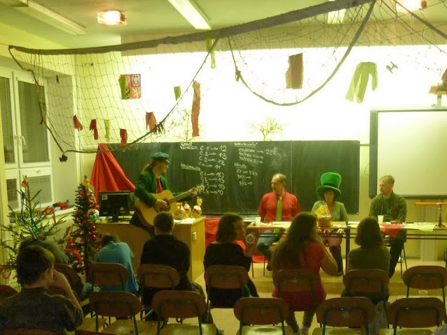v pátek v 17:00 jsme se sešli před státním gymnáziem. Tam Zlesi uspořádal vánoční kvíz. Když jsme dohráli, šli jsme dovnitř a dostali jsme punč, který byl moc dobrý. Vyráběli jsme si lodičky ze skořápek a svíček, které už tam byli připravené, zahráli si vybíjenou sumců kameny(míčky) a potom i elektriku. Pak jsme se zase přesunuli do jiné třídy, kde nás čekalo překvapení. Ne dárky, jak jsme si mysleli, ale soutěž o nejlepšího utopence. Podle mě, byl nejoriginálnější recept u TOFÍKŮ, protože měli v nálevu červené zelí. Ale asi proto ,že měli dva nálevy, vyhrála schůzka KAPABARU. Stejně si myslím, že jsme měli nejhezčí utopence, protože jsme v nálevu jako jediní měli mrkvové hvězdičky. Teprve pak jsme začali rozbalovat dárky. Bylo jich spousta. Když jsme je všechny rozbalili, rozdělili jsme se do skupin, ve kterých jsme dělali vánoční zvyky, jako je pouštění lodiček, rozkrajování jablka a rozlouskávání oříšků. Byli jsme nacpaní utopencema, rozkrojenými jablky a cukrovím až prasknutí, takže se duhová besídka rozpustila a začala akce Brno...