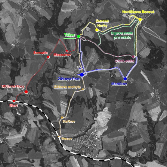 červená - páteční trasa do Horek
