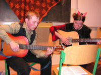 Po několika klipech se ujala Lucyš a Míra kytar a snažili se nás rozezpívat... Nutno podotknouti, že se jim to až na pár výjimek povedlo... |