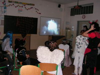 | Místy začaly vznikat tancechtivé skupinky a takříkajíc si trsali po svém... Koho to moc nebralo, ten sledoval projekční plochu s uměleckým pojetím hudby... | Chvílemi seděli úplně všichni - to když vznikaly DROBNÉ technické potíže, nebo když se jim prostě normálně nechtělo. Nebo se styděli... | ||