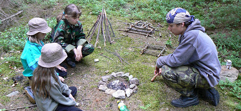 skupinka připravovala ohniště a ostatní vyráběli klacky na