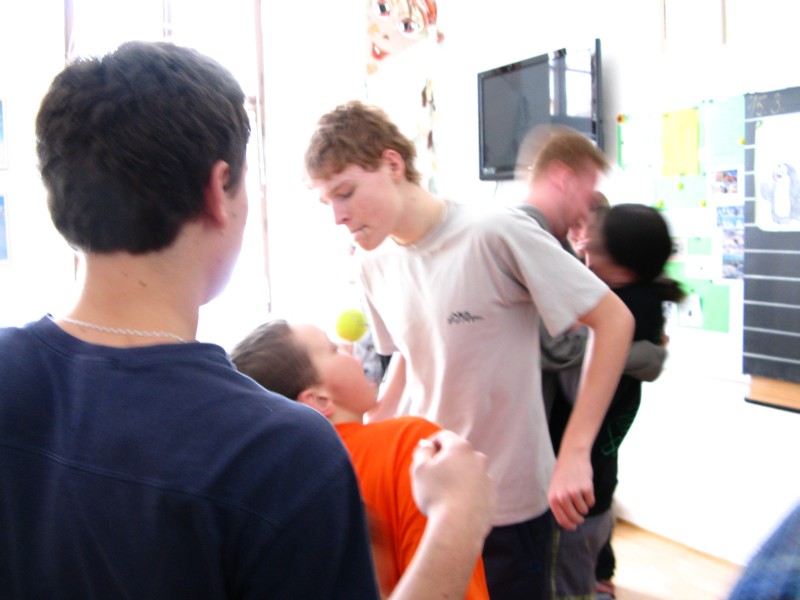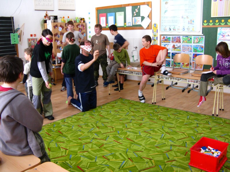 Prvním úkolem venku byl dračí souboj. Ze skupinek se stali draci, měli na zadku šátek a úkolem jiných draků bylo sebrat tento šátek.