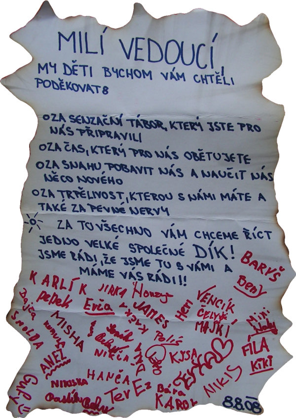 Na závěrečném táboráku děti vedoucím přečetly a předaly toto